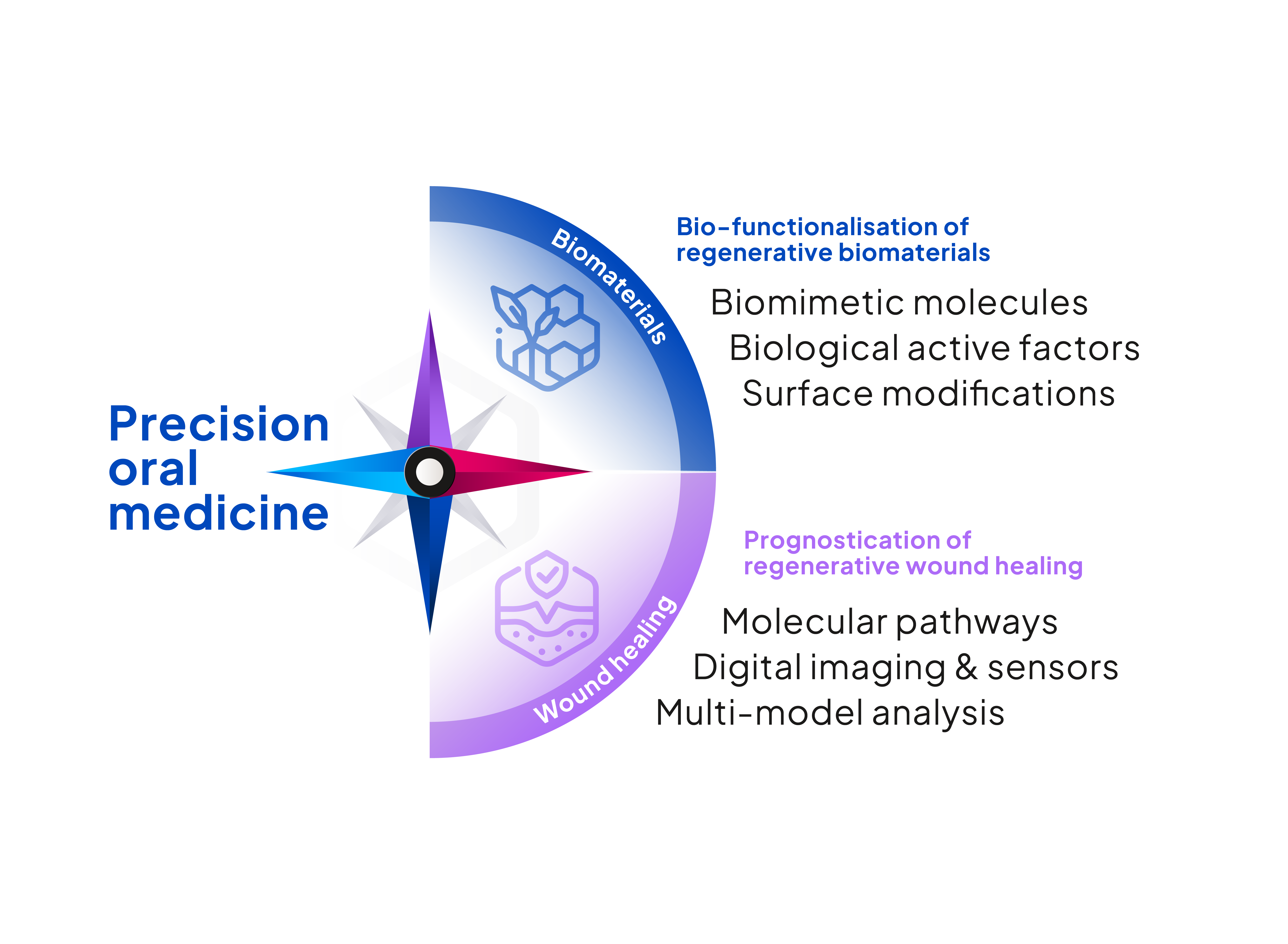 Within this area, the Osteology Foundation seeks to answer clinical research questions on how oral tissue regeneration can be accelerated by modifying tissue regenerative biomaterials (excluding dental implants) that are used in clinical scenarios. Biomaterial functionalisation should be biological in nature, meaning to impart a certain biological activity to the material for example through the incorporation of biomimetic molecules, biological active factors, or surface modifications.
